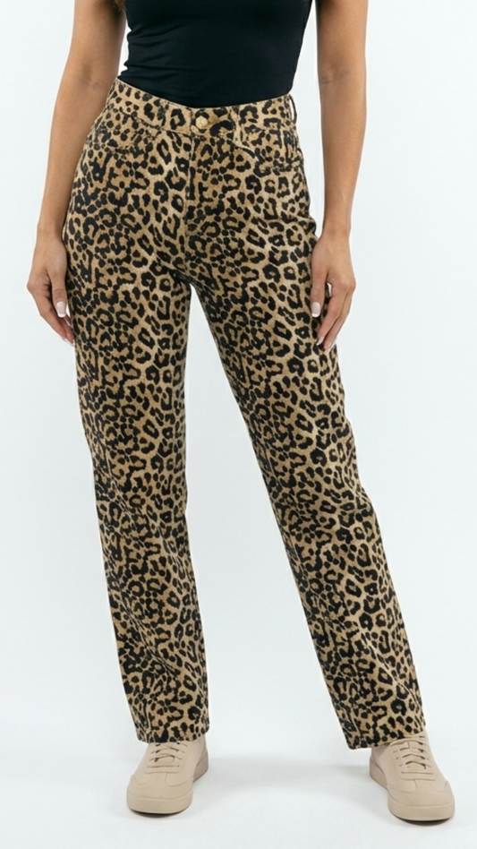 Sara - Leopard Print Raw Hem Straight Leg Jeans