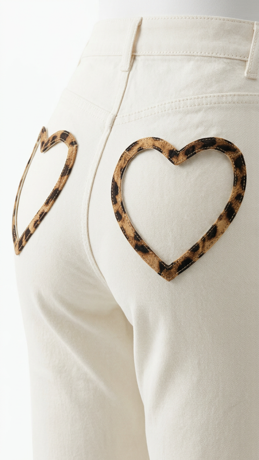 Ollie - Cream Leopard Heart Pocket Denims