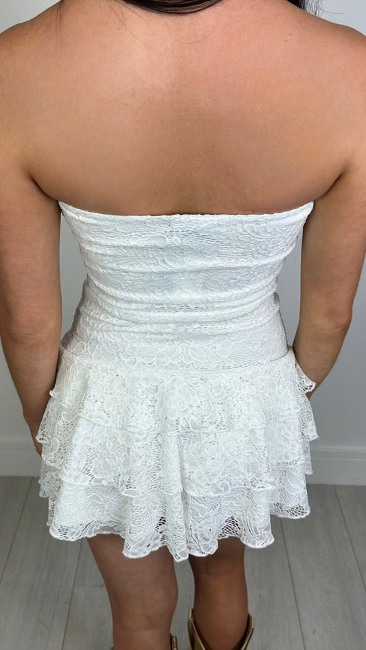 Pia - Bandeau Lace Frill Skirt Mini Dress White