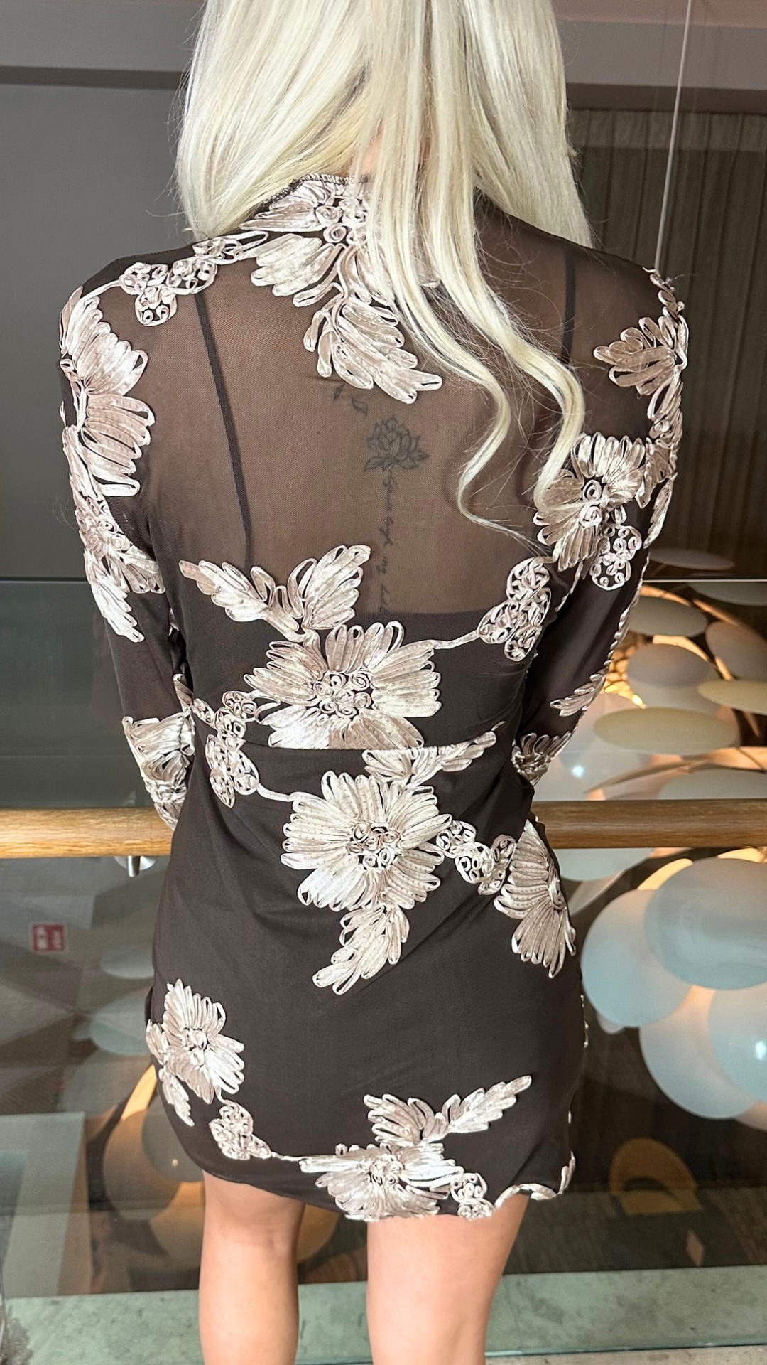 Turn heads in the stunning Aisha Dress, featuring a sheer brown mesh overlay with striking 3D floral embroidery. The built-in insert provides perfect coverage while keeping that sultry, see-through neckline and sleeve detail. Designed with a flattering bodycon fit to accentuate your curves, this piece is ideal for your next night out or special occasion.