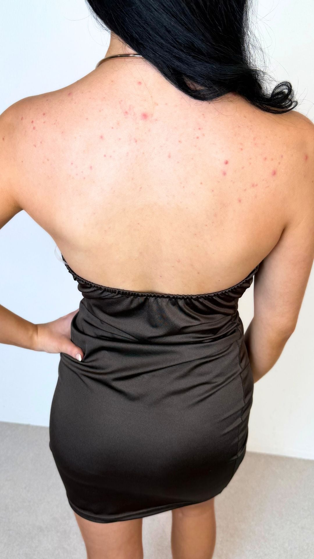 Meet Lottie – the statement mini designed to turn every head in the room. Crafted from a luxe, satin-finish stretch fabric, this dress drapes effortlessly across the body for a smooth, sculpted fit. The standout feature is the striking metal neckline, creating an elegant gathered front that falls into a soft cowl for a modern, high-end look.