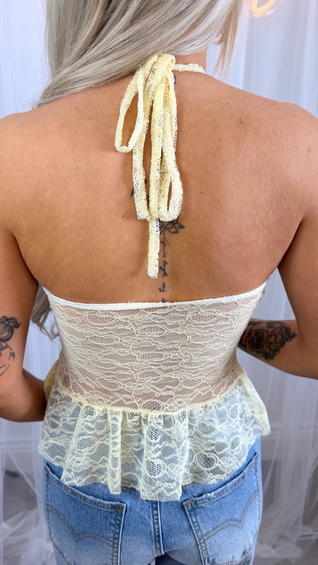 The Naya Top is a delicate lace piece designed to bring a soft, feminine edge to your wardrobe. Crafted in a pale lemon hue, it features a structured bandeau-style bust with a flattering halterneck tie and a statement ring detail at the centre. The sheer lace body creates an elegant silhouette, finished with a subtle peplum hem that enhances the waist and adds a romantic touch.
